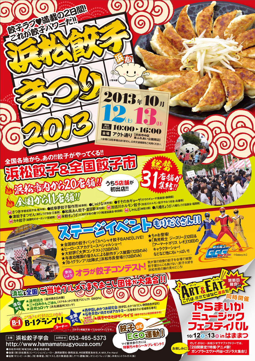 2013-09-28 10月12日〜13日は浜松餃子まつりですね シェアする Twitter Line スポンサードリンク 9月も終わりを迎え大分涼しくなってきましたね。食欲の秋ってことで、全国で食に関するイベントが多数開催され、もちろん各所で餃子に関するイベントも開催されます。その先陣を切って浜松で「浜松餃子まつり」が10月12日、13日に開催されます。あのスペシャオ餃子BANDのライブも行われるそうですよ。会場は浜松アクト通り東ふれあい公園周辺です。浜松市内はもとより、東京や名古屋などからも浜松の餃子を食べに多くの来場者がやってくるそうです。ちょうど3連休なので、ちょっと足を伸ばして、浜松と全国の餃子を食べ比べてみてはいかがでしょうか?